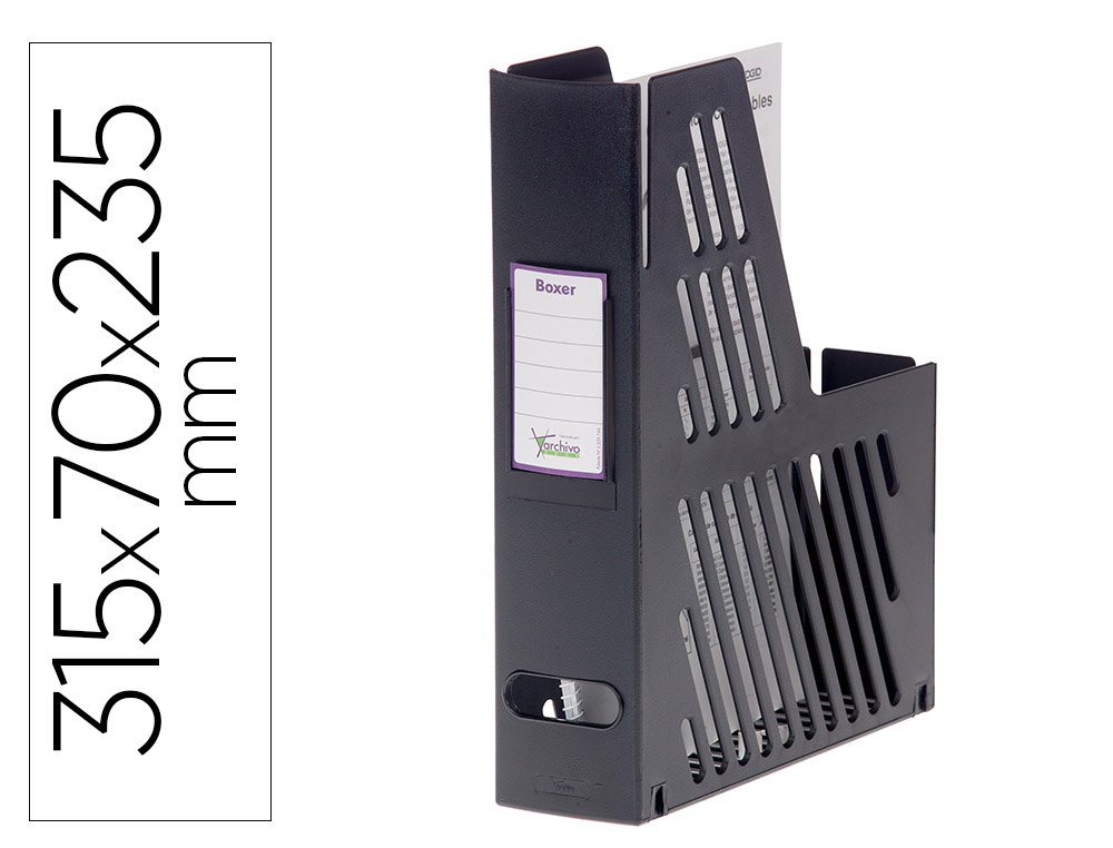 - Dimensões: 240 x 75 x 315 mm, adaptado para armazenamento vertical de documentos e revistas em formato standard.
